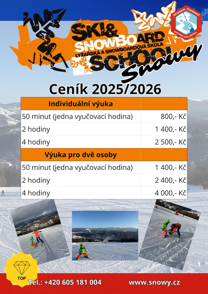 Výuka lyžování a snowboardingu probíhá privátně nebo skupinově se zkušenými lektory. Záleží na vás, která varianta je vám bližší.